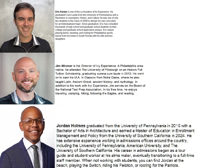 Join us for an informative program to learn about the current state of college admissions and uncover the mysteries behind the admissions process. Led by Eric Karlan, Founder of Ivy Experience, and a leading college consulting practice with over 15 years of experience helping families and students achieve their collegiate goals. Eric will also be joined by admissions experts, Jim Wisner and Jordan Holmes (see speakers bios below).